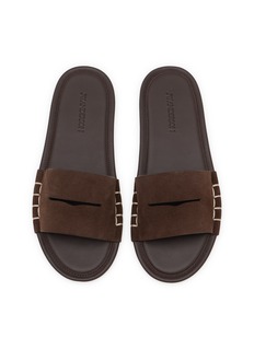 These J.W. Anderson slides capture a minimalist aesthetic with a luxurious touch, featuring a sumptuous chocolate suede band adorned with distinctive silver-tone hardware. The design is both understated and sophisticated, ensuring versatility and comfort with a molded footbed for added support.