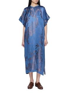 The blue floral satin dress exudes effortless elegance, its lustrous fabric and dramatic botanical print creating a striking, fluid silhouette. The relaxed fit, short sleeves, and side slits add a touch of modern sophistication, making it a versatile statement piece for both day and evening.