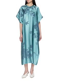 A fluid satin silhouette animated by tonal florals, this short-sleeved dress by KatliaX drapes with quiet opulence. Silk wadding lends subtle body and warmth, balancing ease and refinement—ideal for gallery afternoons or pared-back evenings with sculptural heels.
