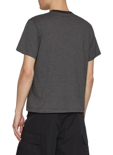 This short-sleeve striped tee from KHOKI reimagines everyday casualwear with nostalgic charm. Crafted from soft cotton jersey, it features a bold horizontal stripe pattern in warm colour, creating a retro-inspired visual rhythm. The embroidered house motif, paired with the word "School," adds a whimsical narrative touch, infusing the piece with playful character. Lightweight and breathable, it effortlessly anchors casual styling, making it a versatile staple for the modern wardrobe.