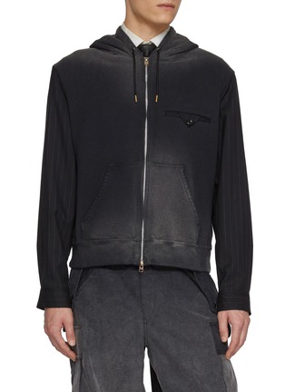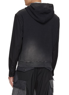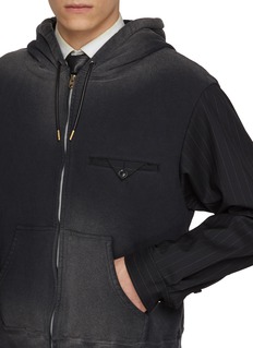 This hybrid zip-up hoodie from KHOKI reimagines casual comfort with sartorial precision. The main body is crafted from faded black cotton jersey, featuring a gradient wash that lends a lived-in, vintage edge, while the sleeves are constructed from fine pinstriped shirting fabric—creating a deliberate contrast between relaxed sportswear and tailored formality.