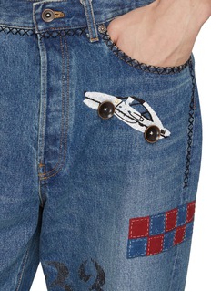 These hand-embroidered straight-leg jeans reimagine classic American workwear through a lens of artisanal storytelling. Crafted from medium-wash indigo denim, they are adorned with a whimsical tapestry of hand-stitched motifs. The contrast stitching at the waistband and pockets adds a rugged, handcrafted edge, while the straight-leg cut delivers a timeless, versatile silhouette. A definitive statement piece, they seamlessly blend functional denim heritage with playful, narrative-driven design.