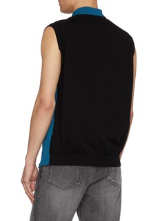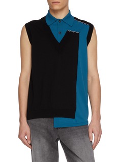 Kolor distorts the familiar polo through sharp geometry, layering asymmetric colour-blocked panels with exposed stitch detailing. The sleeveless cut sharpens the silhouette, balancing knit softness with a graphic edge that works effortlessly with denim or tailored trousers.