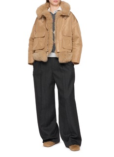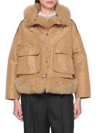 Cast in a warm, earthy tone, this detachable fox trim jacket leans into a more utilitarian expression. The cropped proportions and oversized cut create a confident silhouette, while the removable fur trim allows the look to shift seamlessly from functional daytime wear to elevated cold-weather layering.