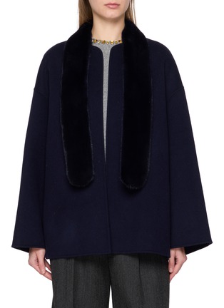 Quietly luxurious, this coat balances architectural ease with tactile refinement. The detachable mink collar adds depth and warmth to the fluid cashmere silhouette, allowing the piece to shift effortlessly from understated daytime polish to evening elegance.