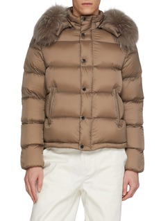 A modern cold-weather essential by KRUF, this down jacket balances streamlined quilting with functional refinement. The detachable raccoon-trim hood adds adaptable warmth and textural contrast, making it a versatile layer for city dressing through the depths of winter.