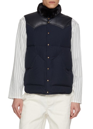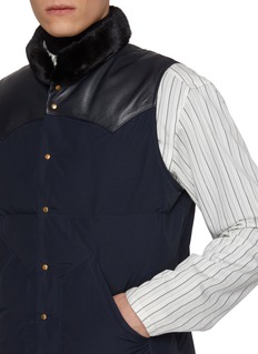 Defined by material contrast and refined warmth, this down vest by KRUF layers smooth lambskin leather across the yoke with a lightweight nylon body. Finished with a plush mink-fur collar, it elevates everyday layering—from shirting to knitwear—into a polished cold-weather statement.