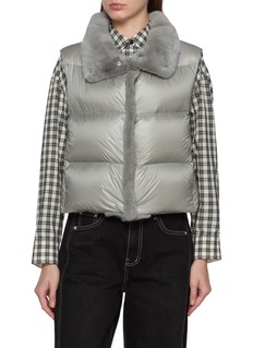 A polished reinterpretation of KRUF’s signature down vest, this iteration highlights its architectural silhouette through a cool, silvery sheen. The voluminous mink-fur stand collar rises elegantly to frame the face, while the plush fur-trimmed placket softens each line. A refined winter layer that balances tactile luxury with contemporary minimalism—perfect for pairing with clean tailoring or textural knits.