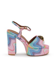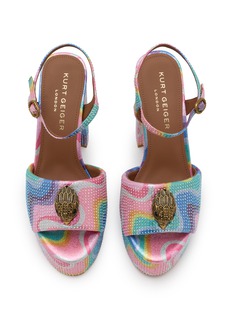 The Kensington Platform Sandal features a pastel rainbow-stripe printed upper, which is embellished with iridescent crystals. Kurt Geiger's signature antiqued brass eagle head sits on the top of the toe strap.