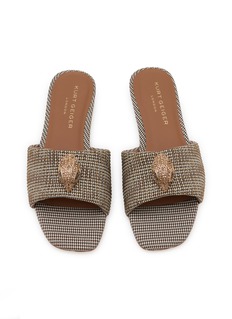 The Kensington flats are crafted from a beige houndstooth fabric topped with opaque gold crystals. These slides feature gold embellishments and black beaded eyes on Kurt Geiger's signature eagle head.