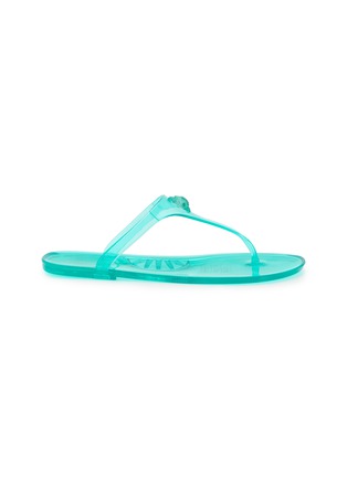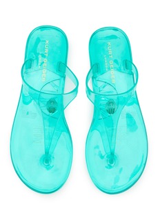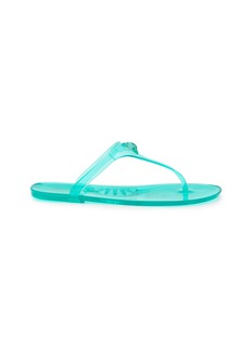 These streamlined jelly flip-flops feature a minimalist thong design with the signature logo embossed at the strap for subtle brand distinction. The translucent construction offers lightweight comfort and effortless slip-on ease, perfect for poolside relaxation or beach escapes. A timeless warm-weather staple that delivers understated chic.