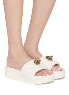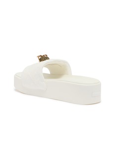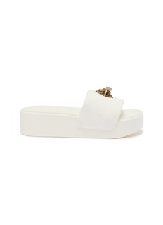 These contemporary platform slides feature a sleek single-strap upper adorned with a striking geometric eagle emblem for standout appeal. The chunky flatform sole delivers retro-inspired height with comfortable stability, while the slip-on design ensures effortless styling. A bold statement piece that elevates casual looks with modern edge.