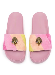 These luxe platform slides feature a plush textured strap adorned with tonal embroidered detailing and the signature eagle emblem. The generously cushioned flatform sole offers cloud-like comfort with trend-led elevation, while the slip-on design ensures effortless styling. A glamorous statement piece that brings playful sophistication to casual looks.