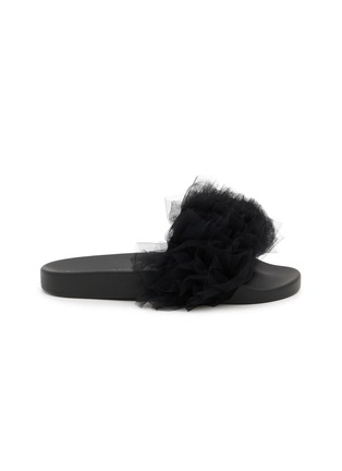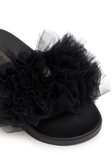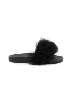 These fashion-forward slides feature dramatic gathered tulle embellishments that create voluminous texture and romantic flair. The contoured footbed ensures all-day comfort, while the slip-on design paired with ethereal ruffles makes an instant statement. A glamorous pool-to-party essential that transforms casual styling with couture-inspired details.