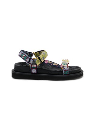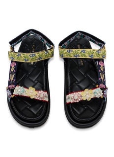 These statement sport sandals feature vibrant jacquard straps with intricate embroidered motifs and charming embellishments for eclectic appeal. The adjustable hook-and-loop closure ensures a customized fit, while the chunky platform sole delivers contemporary edge with comfortable elevation. A bold fusion of athletic styling and artisanal craftsmanship.