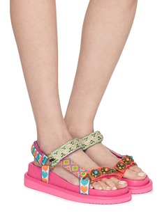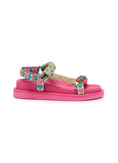 These vibrant platform sandals feature bold geometric-patterned straps adorned with eclectic embellishments and metallic chain detailing for playful maximalist appeal. The adjustable hook-and-loop closure ensures customized comfort, while the chunky flatform sole delivers on-trend elevation. A festival-ready statement piece that brings joyful energy to warm-weather wardrobes.