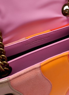 This statement shoulder bag captivates with vibrant wave-striped paneling and the signature ornate emblem closure. The sculptural curved flap creates dynamic visual movement, while the chunky chain strap offers versatile crossbody or shoulder styling. A head-turning accessory that fuses artistic flair with contemporary elegance for the bold sophisticate.