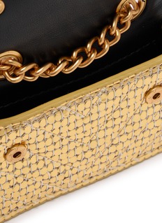 A refined expression of Kurt Geiger’s iconic Kensington line, this bag is crafted from raffia with a metallic finish. Adorned with an eagle head and chain strap, it lends polished ease to both daywear and evening looks.
