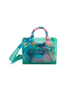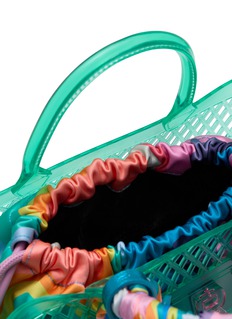 Kurt Geiger's Jelly tote bag is crafted in a vibrant vinyl jelly mesh fabric. Featuring an inner pouch in a patterned fabric matching the satin scarf wrapped around the handle.