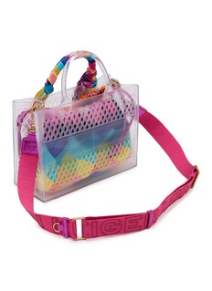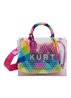Kurt Geiger's Jelly tote bag is crafted in a vibrant vinyl jelly mesh fabric. Featuring an inner pouch in a patterned fabric matching the satin scarf wrapped around the handle.