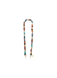 This LA COQUE FRANCAISE phone strap showcases a captivating array of multicolored links, creating a playful yet sophisticated accessory. The varied hues, including teal, burgundy, and classic neutrals, are thoughtfully arranged to provide an engaging visual texture that complements any outfit. Finished with a signature charm and a secure clasp, this piece is perfect for those looking to add a vibrant touch to their wardrobe.