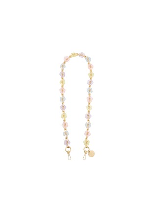 This phone strap by LA COQUE FRANCAISE is a charming addition to any jewelry collection. Adorned with pastel-hued floral accents in soft pinks, blues, and yellows, it radiates a gentle, feminine vibe. The light-colored flowers are seamlessly integrated with elegant gold-tone links, creating a harmonious blend of color and shine.