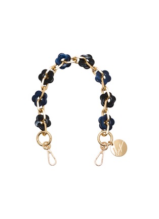 This phone strap by LA COQUE FRANCAISE merges playful charm with elegance. It features a bold chain adorned with deep blue floral accents, creating a delightful contrast against the warm gold-tone links. The design includes a chic signature charm and a practical clasp, ensuring both style and functionality.