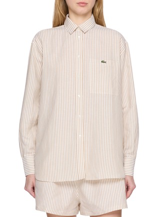 Lacoste presents an oversized shirt with vertical seersucker striping and signature crocodile emblem for relaxed preppy elegance. The boyfriend-fit silhouette with classic point collar and button-front closure delivers effortless sophistication, while tonal stripe pattern and chest logo create a versatile essential for contemporary wardrobe styling with heritage French codes and timeless casual refinement.