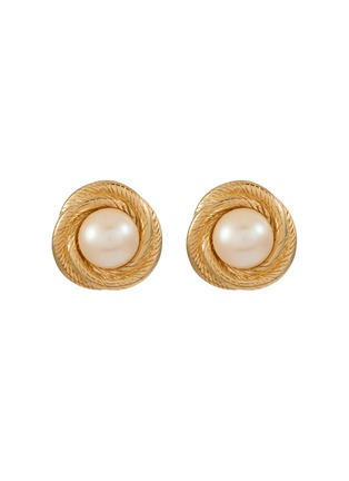 These vintage clip on earrings exude timeless elegance, featuring a lustrous cream-colored faux pearl nestled within a beautifully twisted rope-like frame. The intricate craftsmanship and classic design make them a sophisticated accessory, perfect for adding a touch of vintage glamour and refinement to any look.