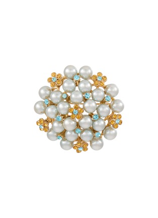 This vintage Scaasi clip-on accessory embodies 1990s opulent charm, with a lush cluster of creamy faux pearls anchored in a gleaming gold-tone frame, accented by bright faux turquoise and shimmering diamanté details that catch light with every movement. The voluminous, textured design blends retro glamour with playful color contrast—its bold yet elegant silhouette feels like a nod to the era’s love of statement pieces. Perfect for elevating any outfit, it balances luxurious sparkle with whimsical charm, making it a standout staple for lovers of 90s maximalist style.