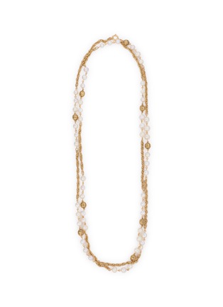 This vintage long necklace encapsulates 1990s elegant ease, weaving soft strands of creamy faux pearls with textured gold-tone beads and chainwork—creating a layered, luminous silhouette that drapes beautifully. The mix of delicate pearl luster and warm gold-tone accents balances retro sophistication with laid-back charm, embodying the era’s love of versatile, understated statement pieces. Its elongated length adds effortless drama, making it perfect for dressing up a simple neckline or layering for that iconic 90s casual-glam vibe.