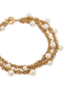 This 1980s double-row necklace radiates lush retro glamour, weaving two layers of gold-tone chain with creamy dangling faux pearls that catch light with every movement. The voluminous yet soft design embodies the era’s love of opulent subtlety—its layered silhouette adds texture and warmth, making it a standout accessory for 80s-inspired looks.