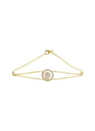 A study in quiet radiance, this 18K yellow gold bracelet centres on a luminous mother-of-pearl disc framed by brilliant and baguette-cut diamonds. Refined yet expressive, it lends a polished glow to everyday tailoring and evening ensembles alike.