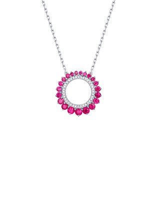 Radiant and contemporary, this necklace centres a vivid circle of round-cut rubies framed by a fine diamond halo. Crafted in luminous 18K white gold, it brings a vibrant pop of colour to daywear while transitioning effortlessly into evening elegance.