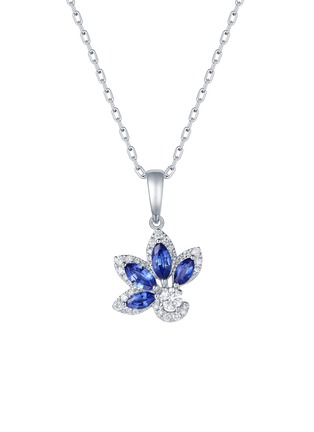 Shaped like a jewel-toned blossom, this 18K white gold pendant pairs marquise-cut blue sapphires with a halo of brilliant diamonds. Graceful and luminous, it brings a romantic accent to everyday elegance and a refined sparkle to evening looks.