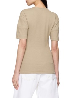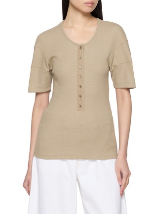 Defined by quiet structure, this fitted Henley top by LEMAIRE is crafted from cotton and linen rib jersey for a fluid, body-contouring feel. Dropped shoulders and a central seam create a sculptural line, while mother-of-pearl buttons lend understated refinement—ideal for pared-back layering or refined everyday wear.