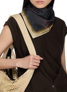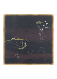 This LEMAIRE scarf is a true embodiment of artistic elegance and sophistication. Featuring a mesmerizing surreal landscape print, the design is composed of delicate, dream-like imagery that invites contemplation. The rich, deep background contrasts beautifully with the subtle, yet vibrant, touches of color in the artwork, enhancing the visual depth and allure of the piece. Crafted from luxurious fabric, this scarf is soft to the touch and offers versatile styling options, whether draped around the neck or used as an accent piece on a bag.