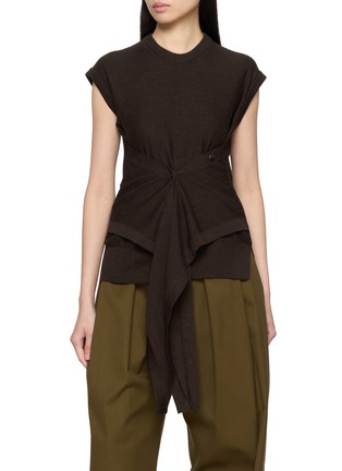Shaped with an architectural sensibility, this sleeveless top by LEMAIRE is crafted from a soft wool-blend knit that balances structure with warmth. An asymmetrical buttoned panel cinches the waist, creating a sculptural drape that feels intentional yet effortless—ideal for refined layering or standalone statement dressing.