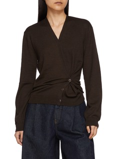 A study in subtle asymmetry, this sweater reveals LEMAIRE’s nuanced approach to knitwear through a twisted construction that gathers softly at the waist. The side button placket allows the silhouette to shift with ease, lending quiet versatility from day layering to pared-back evenings.