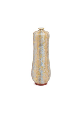This exquisite ceramic vase showcases masterful Japanese craftsmanship with its elegant bottle-gourd silhouette and luminous striped glaze. Crafted using the technique of kinrade to create a sophisticated linear pattern, the piece is enhanced by delicate speckled detailing that adds organic texture and depth. This sophisticated vessel transforms any space into a curated gallery.