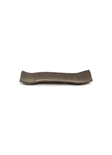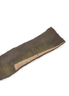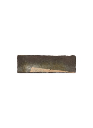 This uniquely elongated plate, with its raw, earthy aesthetic, captures the essence of minimalist design. The plate features a subtle blend of deep greens and browns, accented by a distinct, diagonal slash of lighter tan that adds an unexpected visual interest. Its rustic texture and muted colours evoke a sense of natural simplicity, making it an ideal backdrop for highlighting the textures of gourmet dishes.