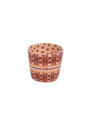 This charming ceramic cup features a delightful array of floral and heart patterns in a rich terracotta hue, segmented by a crisp white band adorned with a delicate bow design. The playful yet sophisticated patterns wrap around the cup, offering visual intrigue from every angle.