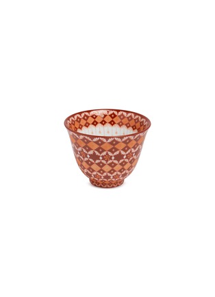 This exquisite ceramic cup boasts a richly patterned design in a warm, terracotta hue, featuring an intricate array of geometric and floral motifs. The delicate white pattern contrasts beautifully against the deeper background, creating a striking visual impact.