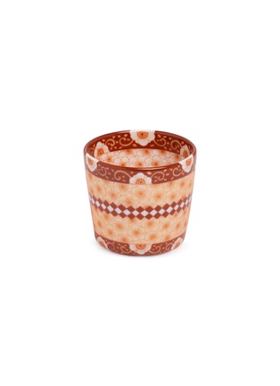 This ceramic cup is a delightful blend of traditional charm and modern design, featuring a warm terracotta hue adorned with intricate floral patterns and a decorative diamond band. The design elements are thoughtfully arranged to create a continuous visual flow around the cup, enhancing its aesthetic appeal.