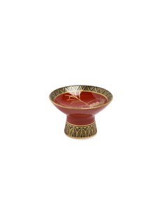 This striking footed plate exemplifies the refined Japanese artistry, featuring a graceful pedestal design that elevates both form and presentation. It showcases a luxurious rust-red glaze adorned with delicate hand-painted botanical motifs, creating a captivating visual harmony. The rim and foot are embellished with intricate geometric patterns in burnished gold, adding a sophisticated architectural element.