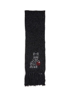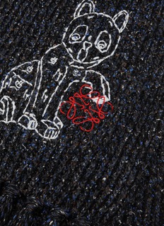Elevate your winter accessories with the LOEWE embroidered wool scarf. This piece showcases intricate embroidery depicting a whimsical bear, adding a playful yet sophisticated touch to its dark, textured background. Crafted from premium wool, the scarf is not only warm but also luxuriously soft, ensuring comfort during the cooler months. The fringed edges provide a classic finish, making this scarf a versatile addition to both casual and formal outfits.