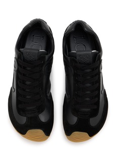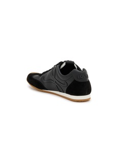 Loewe leather sneakers, designed for both elegance and comfort. Crafted from premium black leather with suede accents, these sneakers feature the subtle yet iconic Loewe anagram. The contrasting gum sole not only adds a stylish twist but also ensures durability and grip.