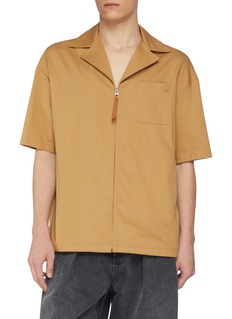 LOEWE's relaxed shirt features a distinctive zip-through closure with leather pull tab, notched collar, and chest patch pocket with embossed Anagram motif. The versatile short-sleeve silhouette offers a refined take on casual dressing. An effortlessly sophisticated piece that blends tailored elegance with contemporary ease.