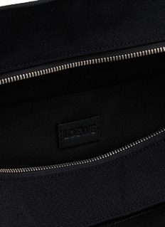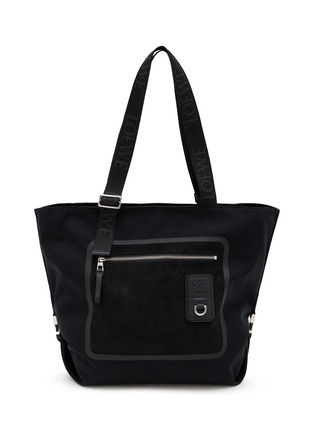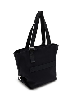LOEWE's spacious tote features a zip-top closure, contrast-framed front pocket with embossed Anagram patch, and logo-jacquard adjustable straps. The structured silhouette includes side compression straps for versatile carrying. A sophisticated everyday essential that seamlessly blends functional design with modern luxury.