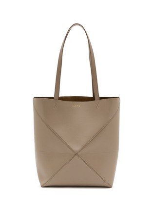 LOEWE's structured tote features distinctive geometric paneling with contrast stitching and slim shoulder straps. The minimalist silhouette showcases the house's refined craftsmanship through architectural seam detailing. A timeless everyday essential that embodies understated elegance and versatile functionality.